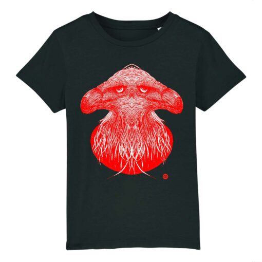 Ce tee-shirt enfant en jersey simple, 100% coton biologique, porte un dessin au stylo-bille retravaillé de l’artiste Georges Drumez.