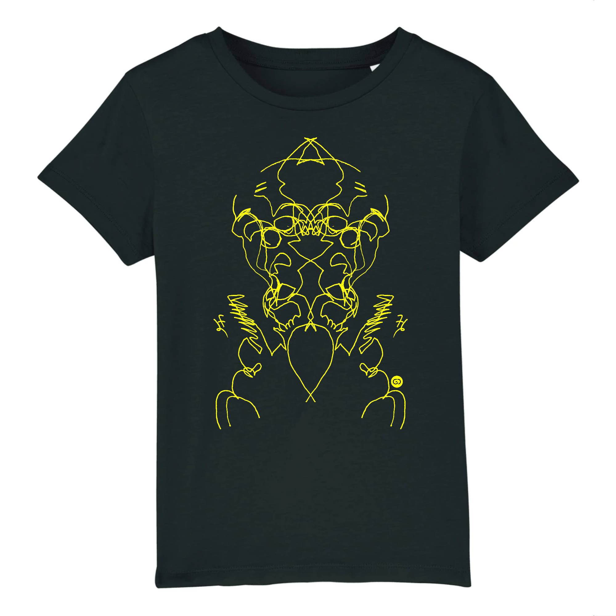 Ce t-shirt enfant en jersey simple 100% coton biologique porte un dessin au stylo-bille réinventé de l’artiste Georges Drumez.