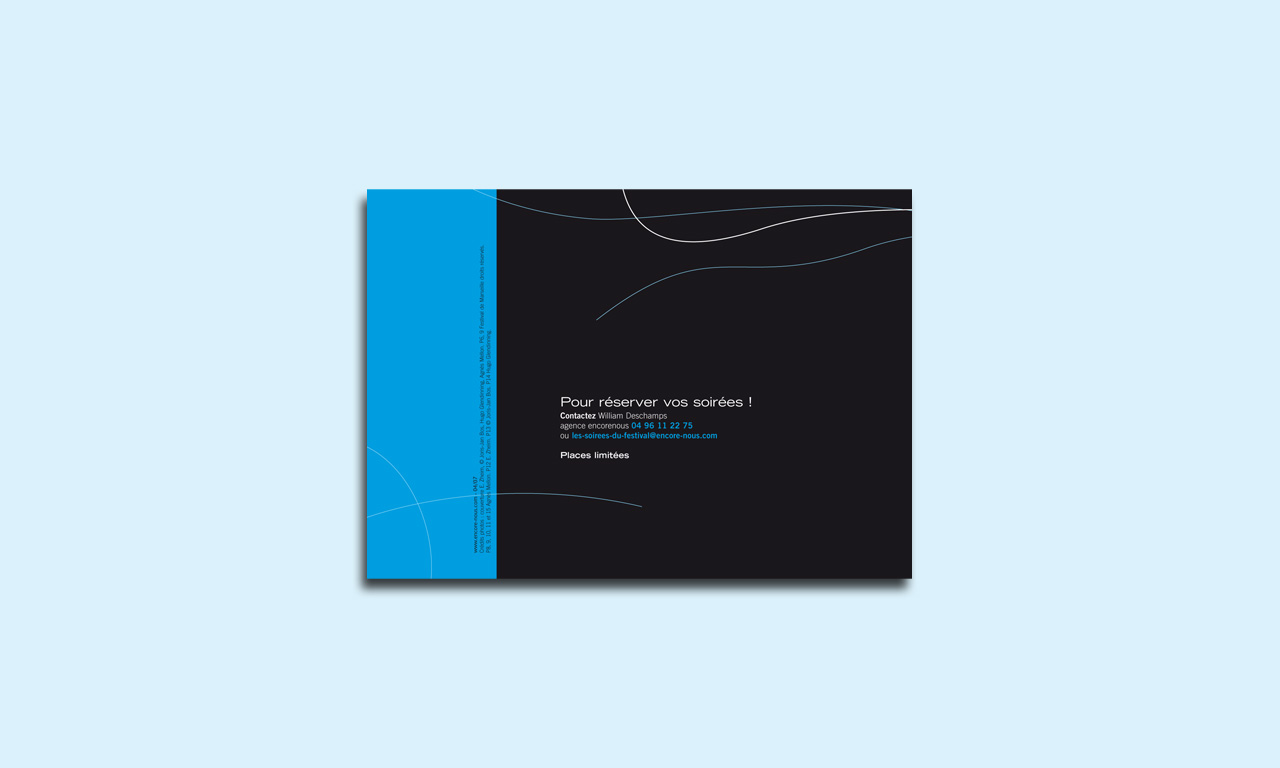 Création et conception graphique d’une plaquette présentant les Soirées Entreprises, dans le cadre du Festival de Marseille.